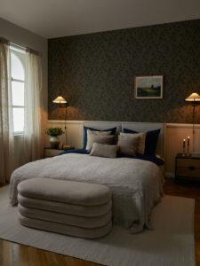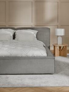 Beige Wände bilden die Basis für allerhand Gestaltungsmöglichkeiten und verleihen einem grauen Schlafzimmer beziehungsweise Bett ausreichend Helligkeit. Ergänzt durch Textilien und Dekoration in Weiß und Hellgrau wirkt der Schlafbereich direkt viel gemütlicher und zugleich super modern.
