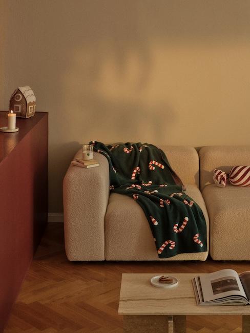 Dunkelgrüne Couch und braunes Kissen